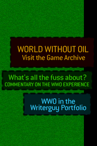 WORLD WITHOUT OIL simulated the first 32 weeks of a global oil crisis. It established a citizen “nerve center” at worldwithoutoil.org to track events and share solutions. Anybody could play by creating a personal story – an email or phone call, or for advanced users a blog post, video, photo, podcast, twitter, whatever – that chronicled the imagined reality of their life in the crisis. The WWO site links to all these stories. The game encouraged excellence with daily awards and recognition for authentic and intriguing stories.